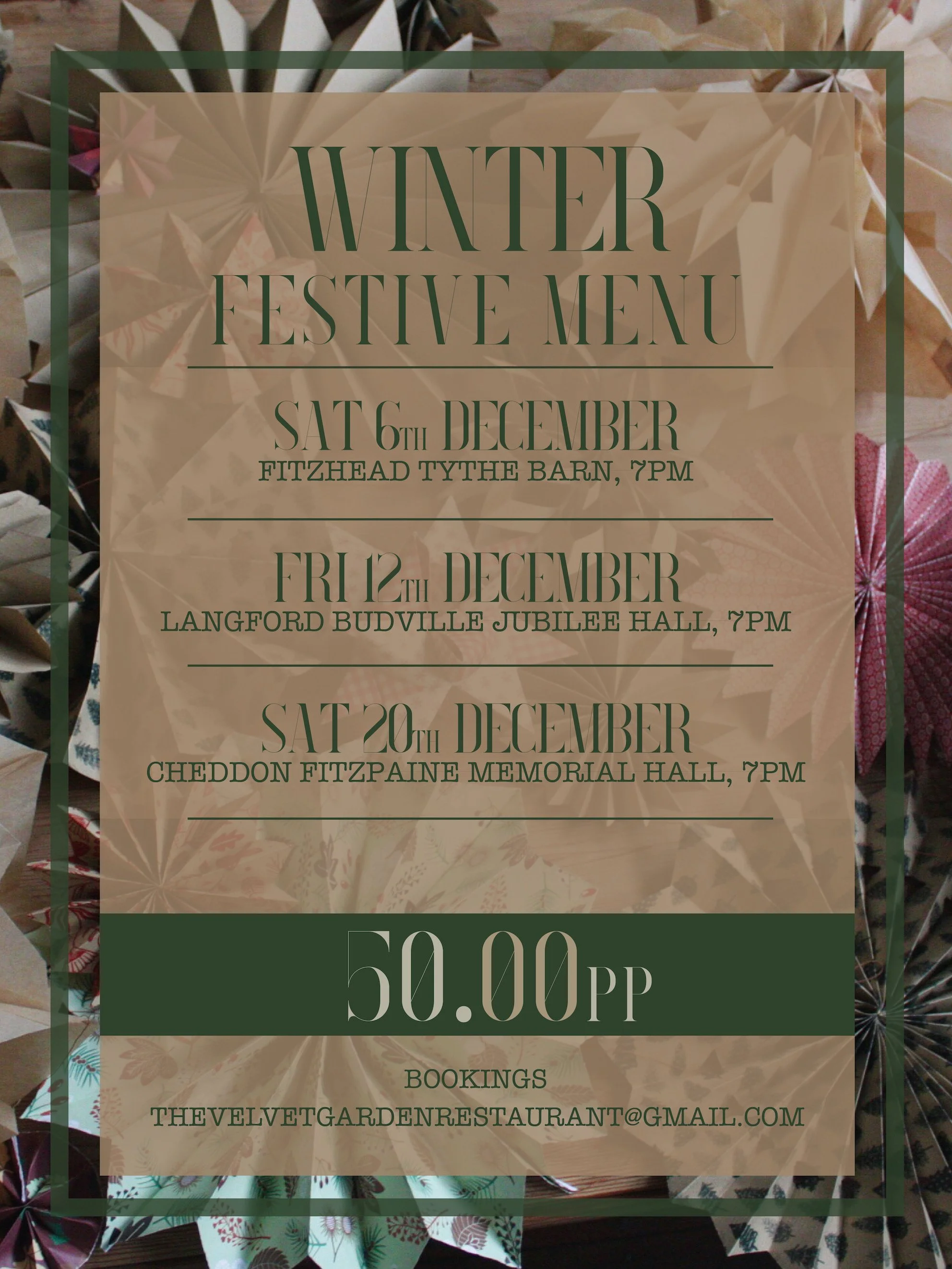 Expect warming dishes with festive accents.Earthy, robust and indulgent flavours - using the best of the seasons' locally grown produce as well as our own homegrown, foraged and preserved delights.